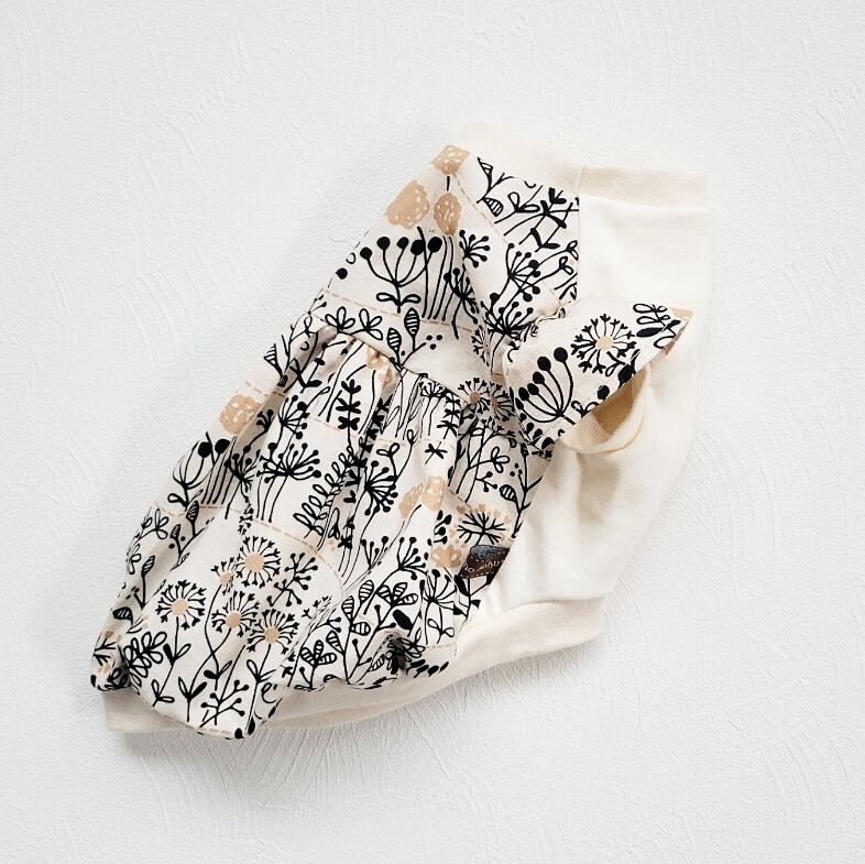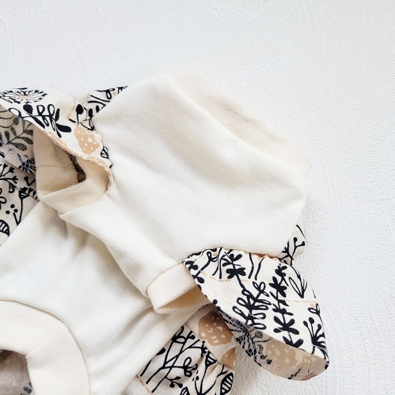 生地は胸部分にはミニ裏毛ニット、背中部分はコットン 90%リネン10%の綿麻シーチング生地を使用しております。