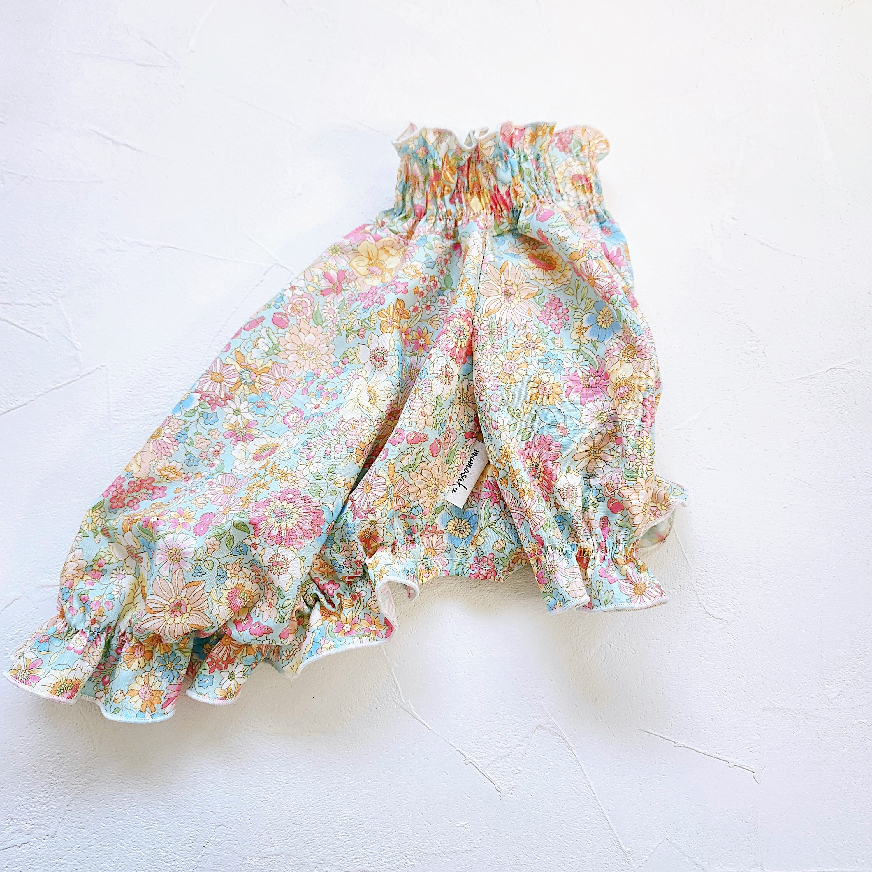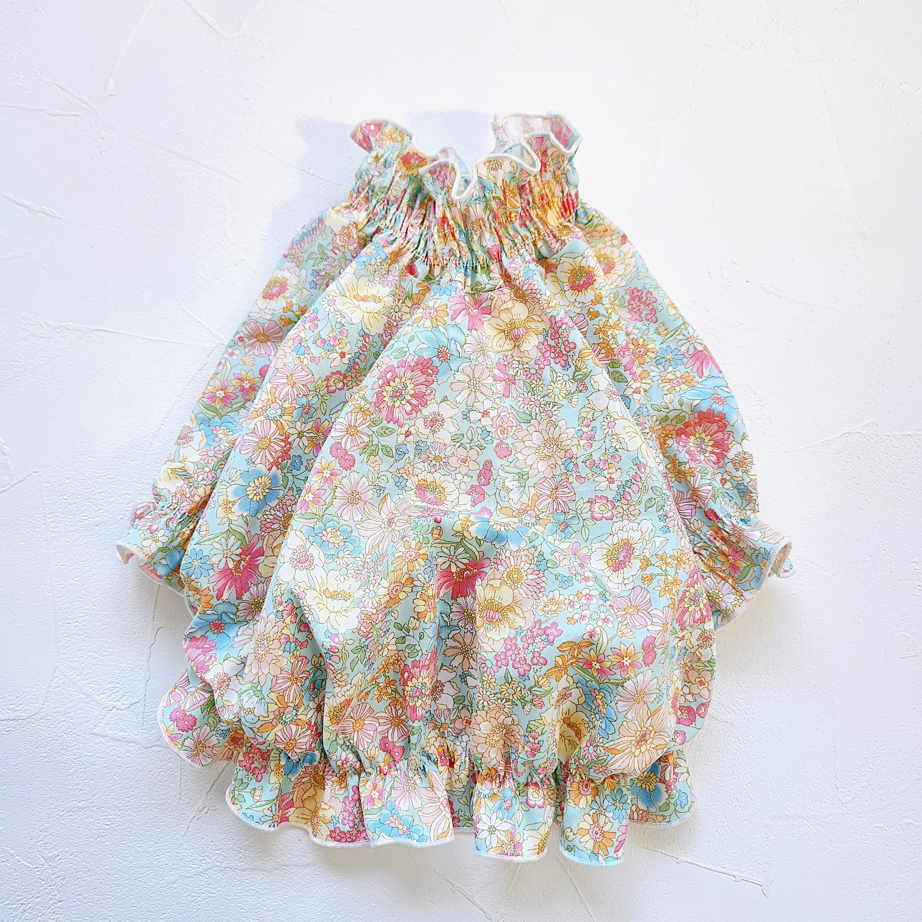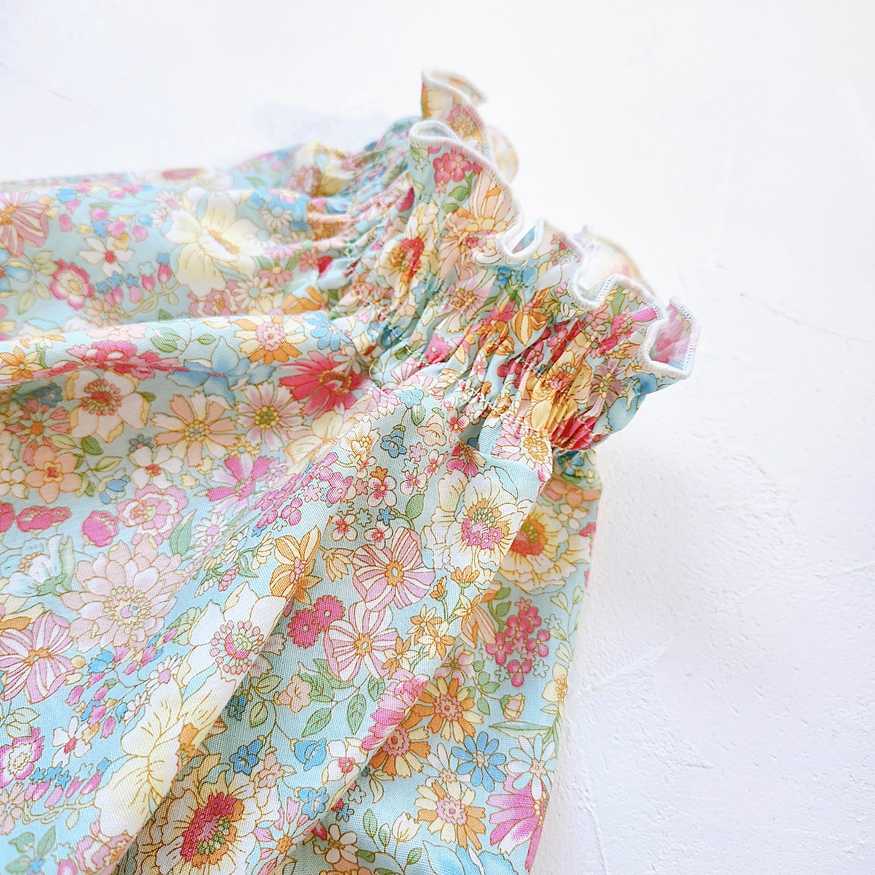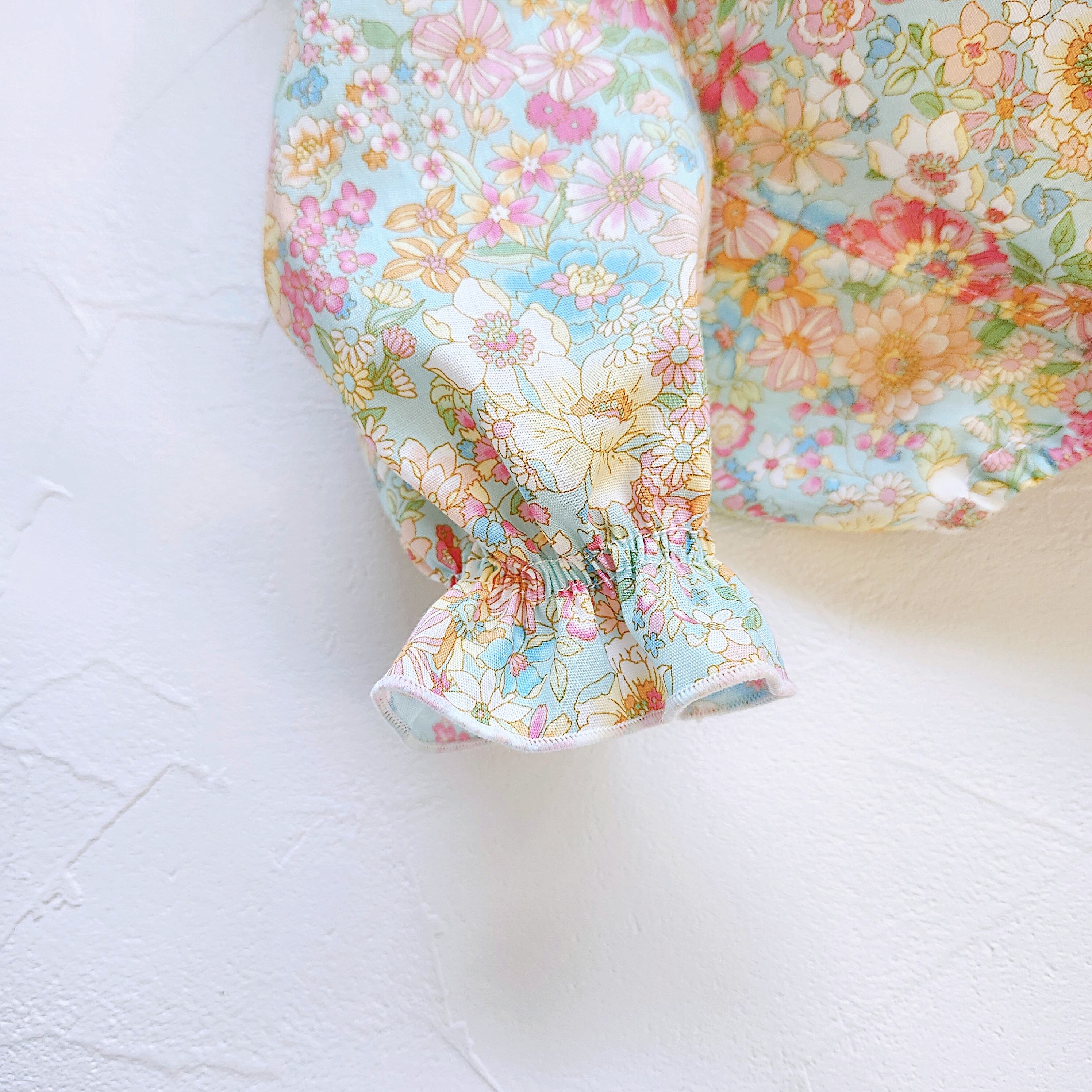 小さなお花がたくさん咲いたやさしい雰囲気のリバティ風のシャーリングブラウス。