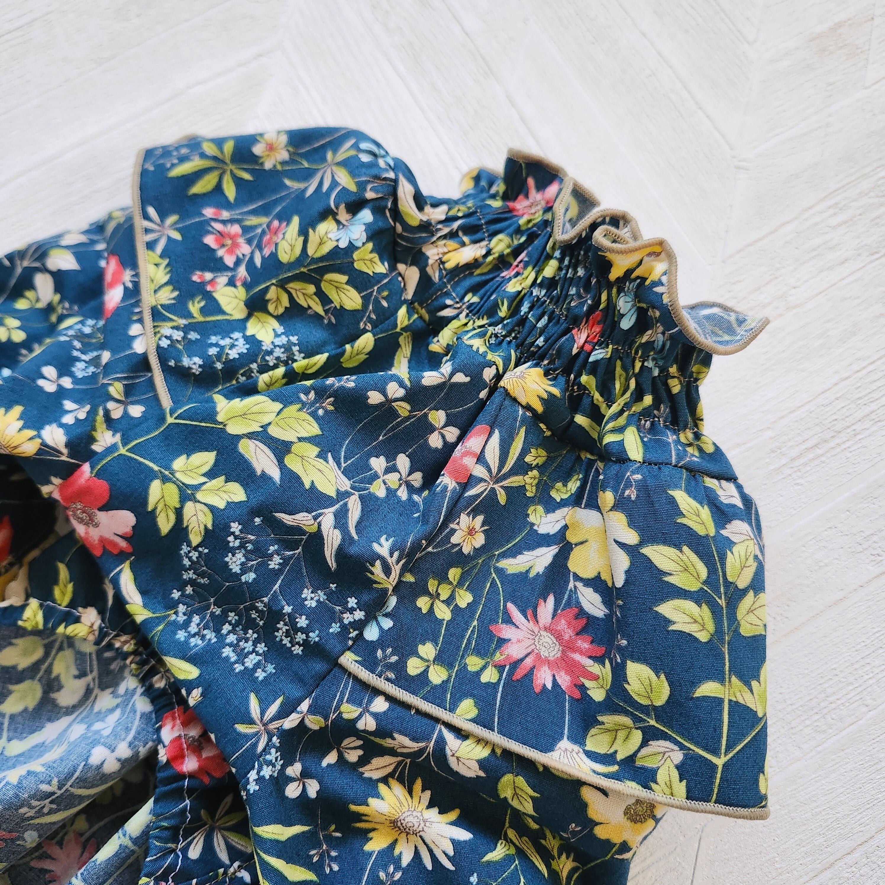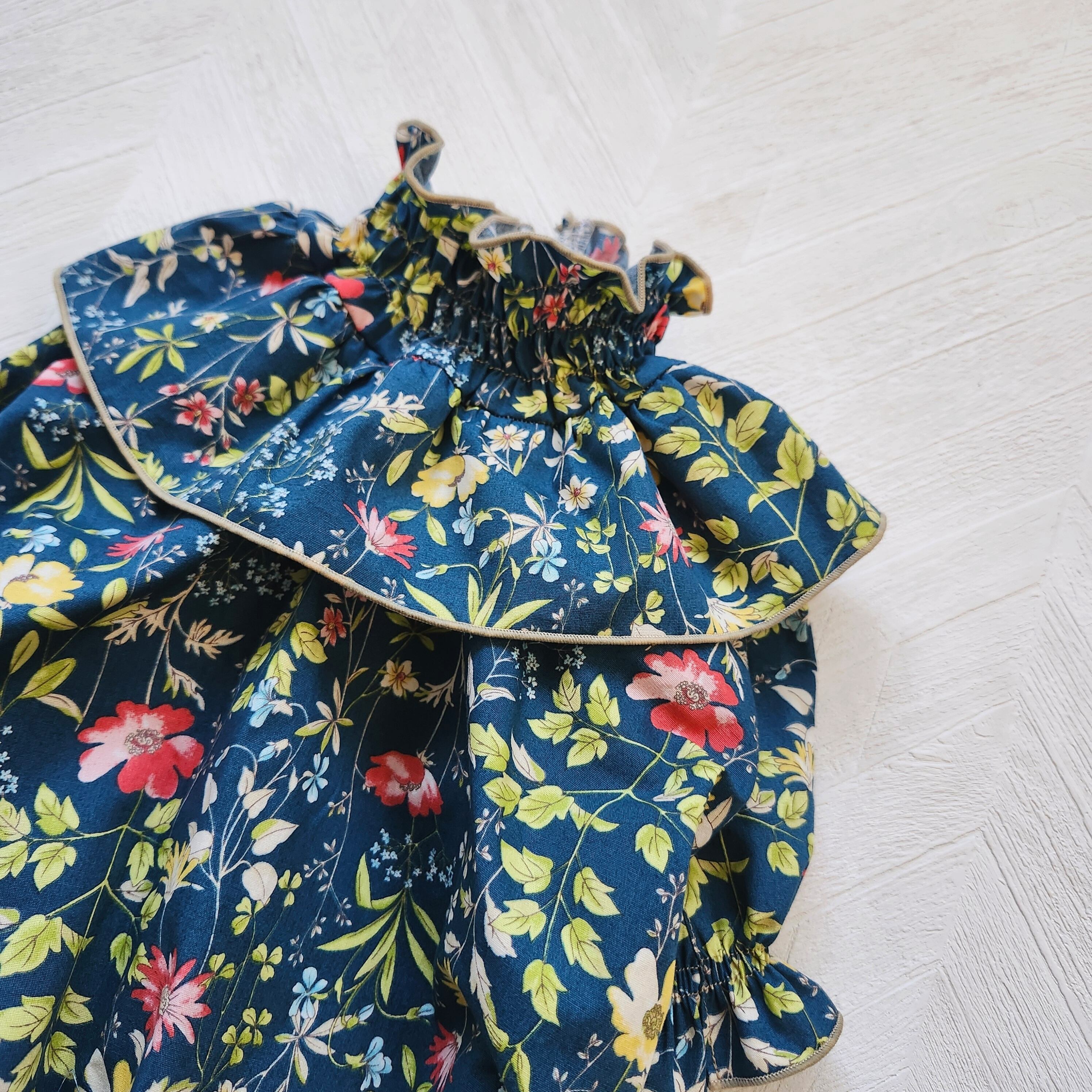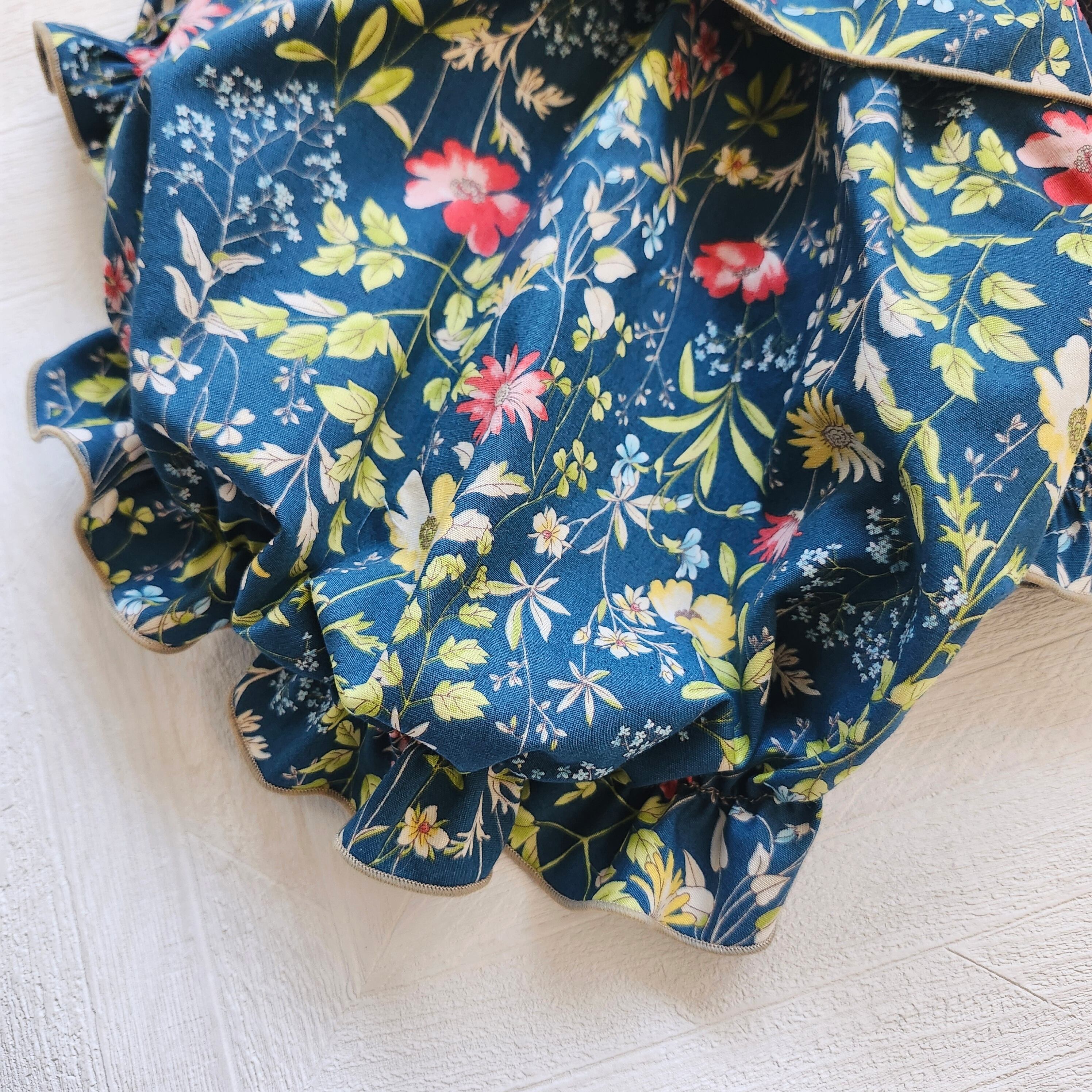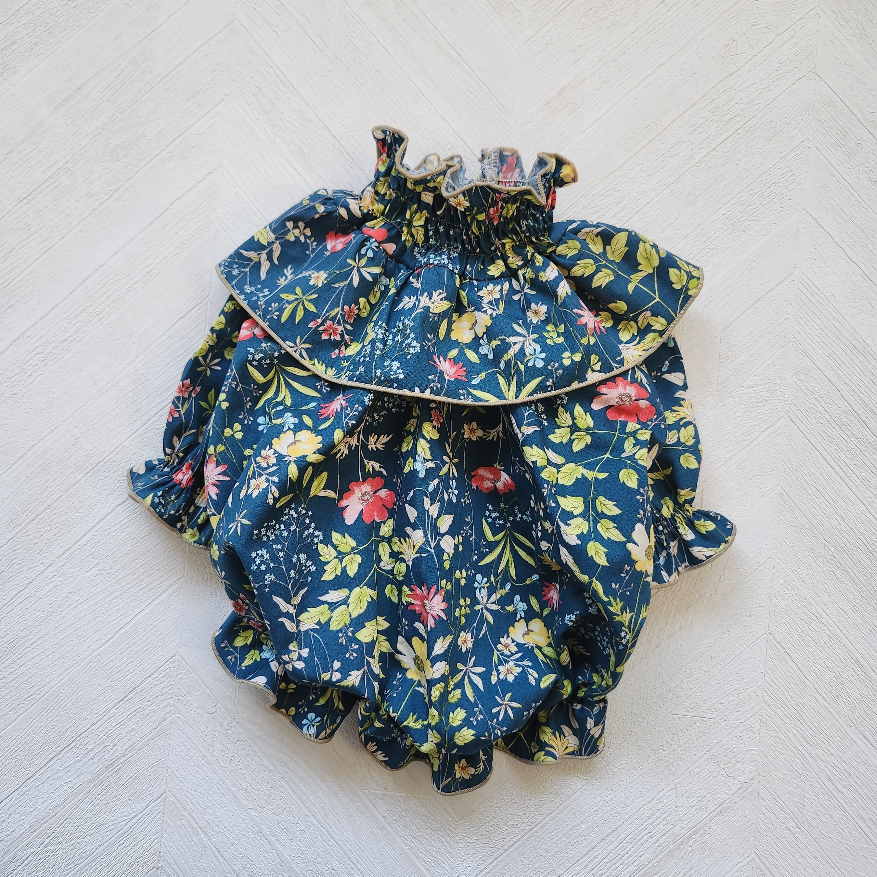 ナチュラルな色合いのフラワープリントにたっぷりギャザーとフリルを合わせふんわり可愛らしい雰囲気に仕上げました。
